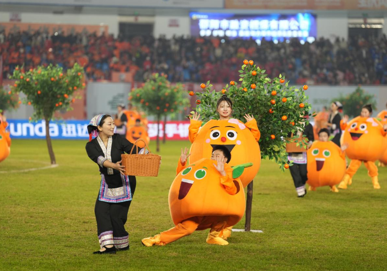 推广季以“湘超”联赛邵阳主场赛事作为开场亮点。11月23日,邵阳队迎战长沙队的绿茵赛事,将体育竞技的激情与脐橙丰收的喜悦巧妙结合。赛场外围设置了脐橙品鉴区、非遗文化展演与农特产品展销,吸引大批观众参与互动;场内则通过“脐橙宝宝”人偶引导、主题花车巡游以及群众歌舞表演,生动传递出新宁的地域文化与崀山脐橙的品牌魅力,实现了“一场比赛,多重传播”的集成效应。