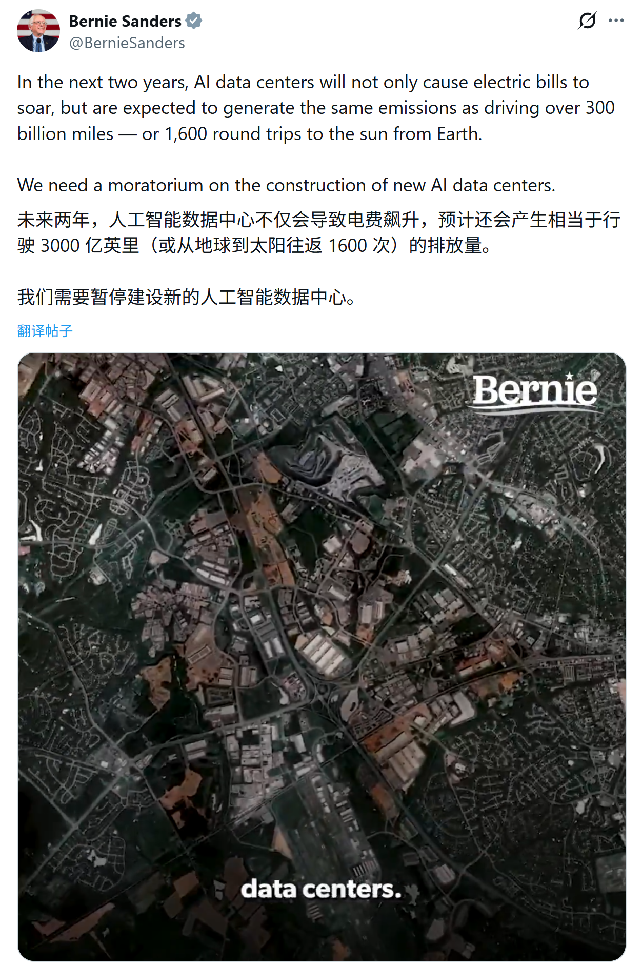 事件起因源于桑德斯公开呼吁暂停新建AI数据中心。他指出,当前AI行业的驱动力更多来自亿万富翁对“财富与权力”的追求,而非普通工薪阶层的利益,并提出两大风险:就业威胁与资源透支。桑德斯警告,AI技术的快速部署可能导致数千万工人失业,同时高能耗数据中心将推高居民电费,其碳排放量相当于汽车行驶3000亿英里的排放总和。因此,他呼吁对新建数据中心实施“冻结令”,以评估社会影响。
