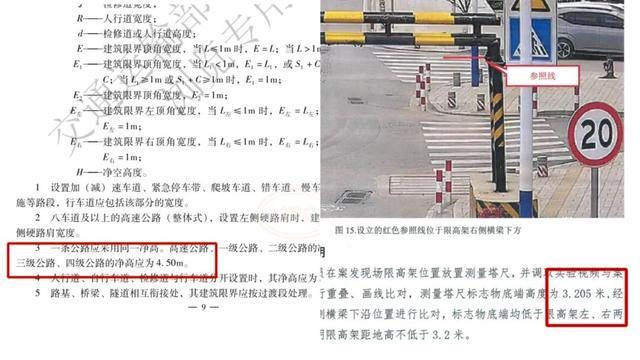 记者在交通运输部查询到《公路工程技术标准》显示,三、四级公路的净高应为4.5米。事发路段属于X229县道,为三、四级公路。然而,该案的《司法鉴定意见书》以及交警部门的现场勘验笔录和照片均显示,事故点的限高架实际高度为不低于3.2米,未达到4.5米的法定标准。