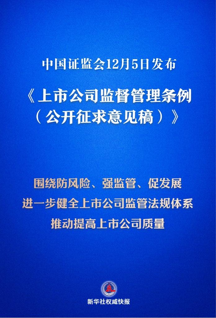 新华社北京12月5日电(记者刘羽佳)中国证监会5日发布《上市公司监督管理条例(公开征求意见稿)》,标志着我国首部专门的上市公司监管行政法规即将落地。该条例在公司法、证券法框架基础上,进一步细化上市公司治理、信息披露等方面的制度安排,对公司持续规范发展具有重要意义。